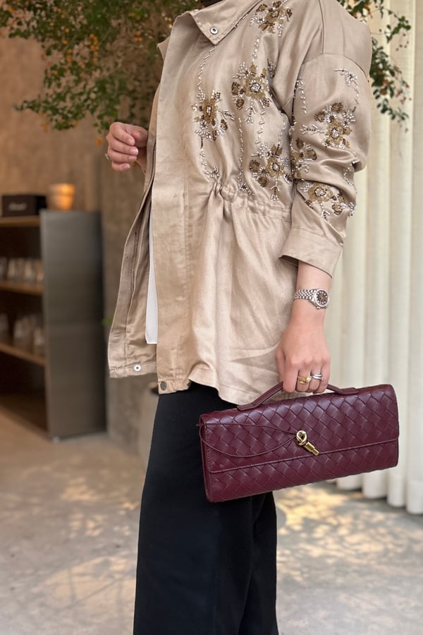 • Stone and embroidery details make it not just outerwear but a powerful complement to your style.